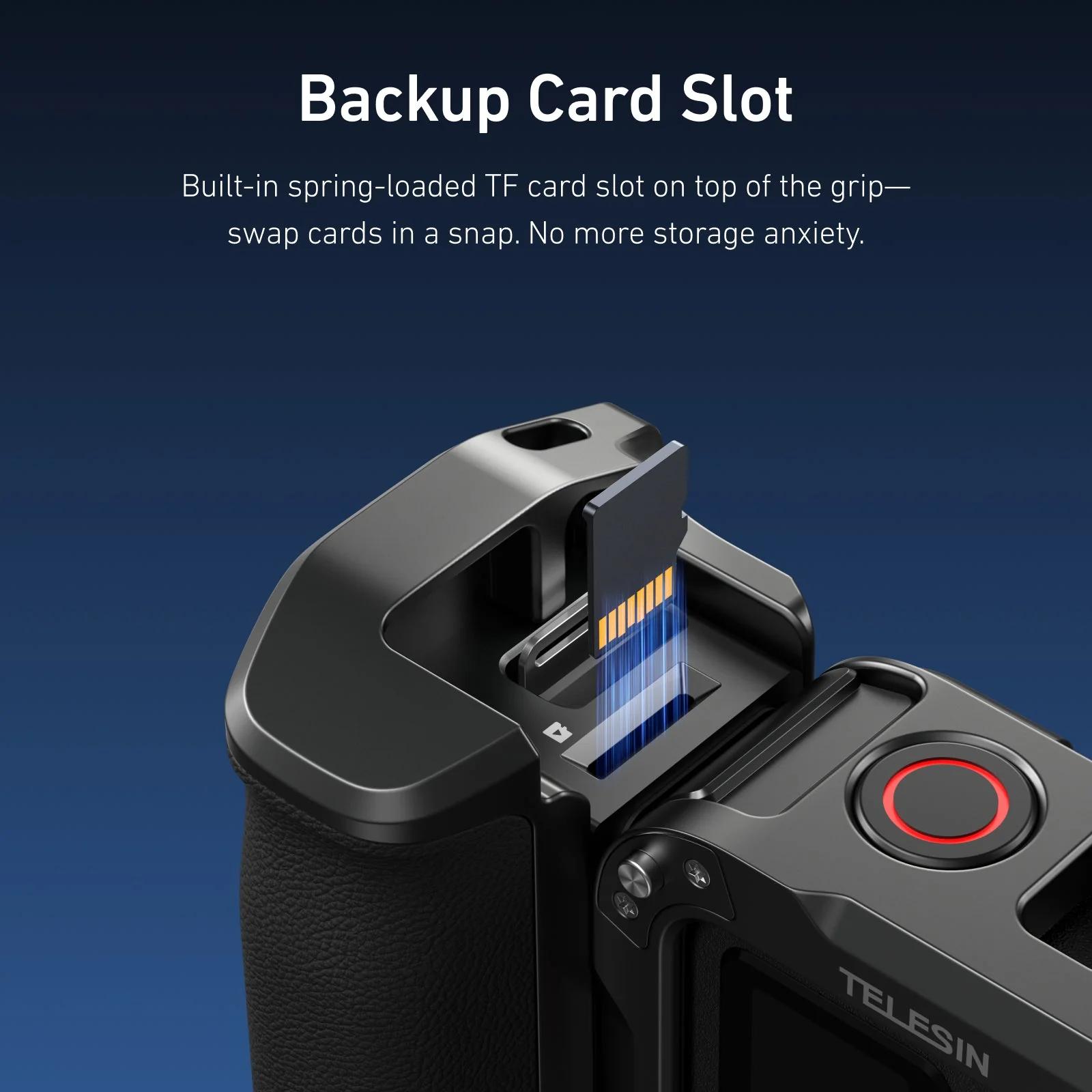 Kit je navržený tak, aby šel používat z boku i zespodu a aby neomezoval běžné ovládání kamery. Praktické je i řešení, které usnadní rychlou výměnu baterie bez zbytečného rozebírání celé sestavy, a horní slot pro TF (microSD) kartu pro rychlou výměnu karty v terénu.