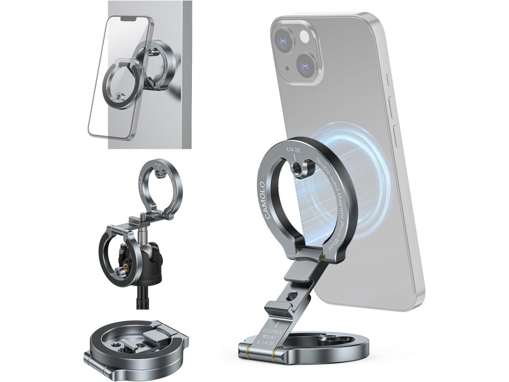 Univerzální a odolný hliníkový adaptér, který díky dvojité magnetické síle bezpečně udrží váš telefon v jakékoli situaci. Skládací konstrukce a možnost uchycení na stativ, kovové plochy nebo jako samostatný stojánek z něj dělají nepostradatelného pomocníka pro natáčení, streamování i běžné používání.