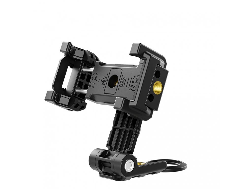 Praktický skládací držák telefonu na stativ který je možno libovolně otáčet, jak na výšku tak na šířku a zároveň tak okamžitě vyrovnat nerovnost stativu, horní sáňky a spodní závit na otočném díle umožňují montáž příslušenství jako je světlo nebo mikrofon. Gumové široké pakny bezpečně sevřou malé telefony o šířce 56 mm až ty největší do šířky 95 mm. V balení je také adaptér pro montáž do sáněk blesku např. na foťák.