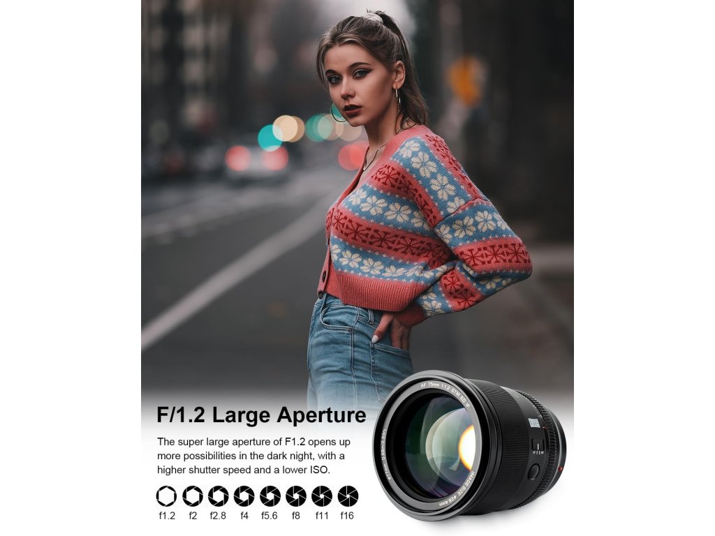 - Velká světelnost F1.2 pro perfektní záběry za šera: Díky super velké cloně F1.2 umožňuje objektiv pracovat s vyšší rychlostí závěrky a nižší citlivostí ISO, což vede k jasnějším snímkům i ve špatných světelných podmínkách. Skvělá volba pro noční fotografii nebo interiérové portréty.