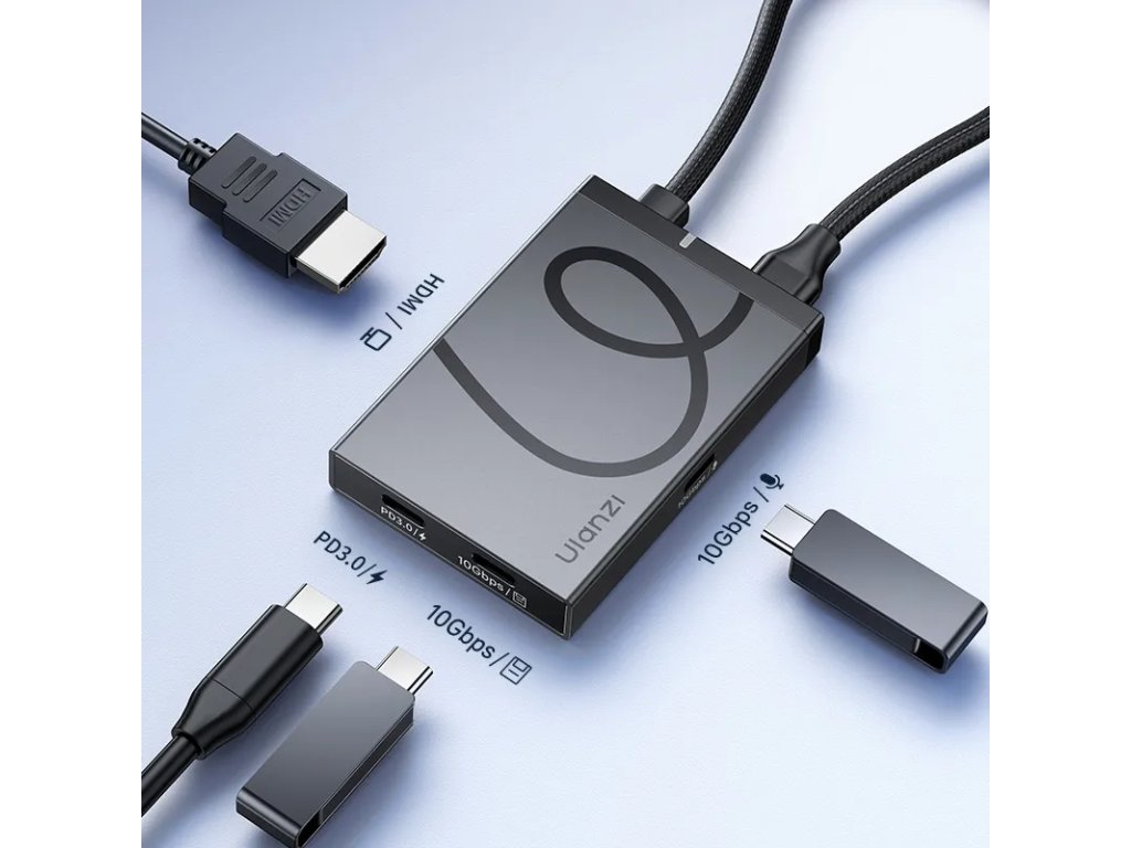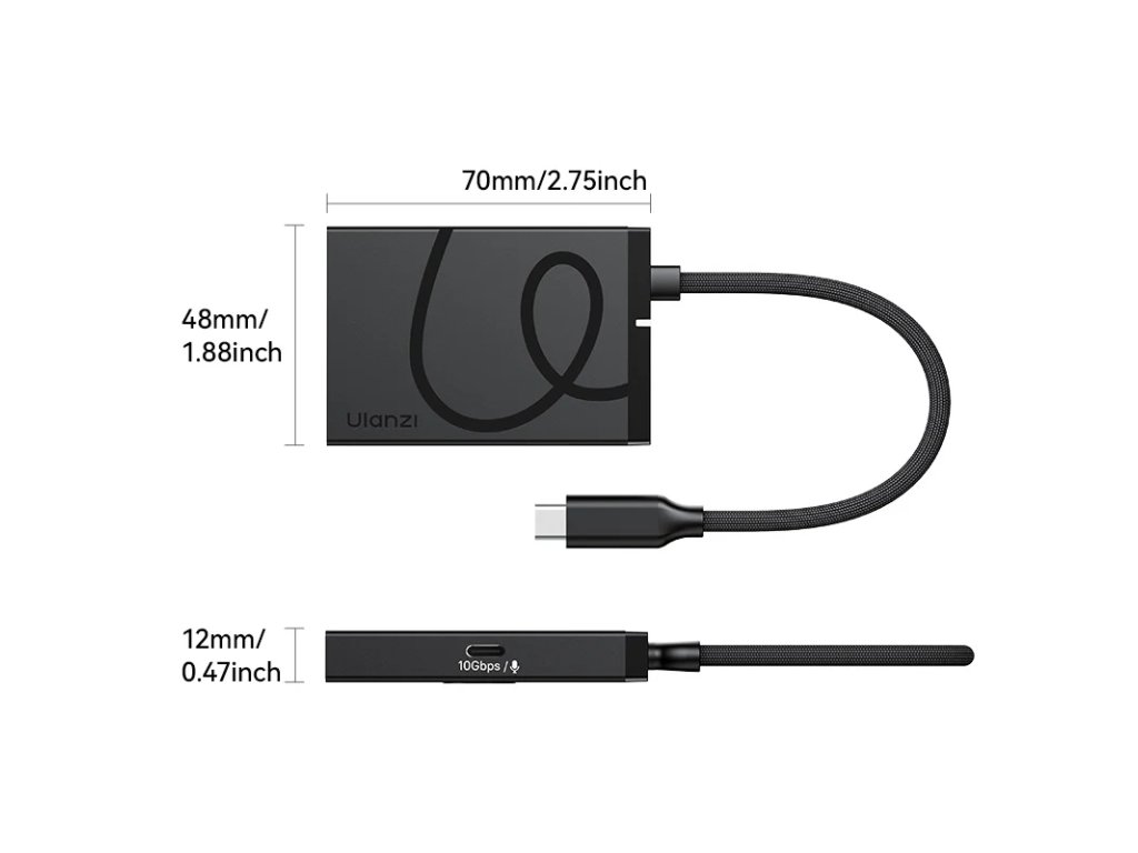 Ulanzi H1 4-in-1 USB-C Media Hub je kompaktní a výkonný rozbočovač navržený pro rozšíření konektivity vašich zařízení s USB-C portem. Díky čtyřem různým portům umožňuje snadné připojení více periferií současně, což zvyšuje vaši produktivitu a usnadňuje práci s různými médii.