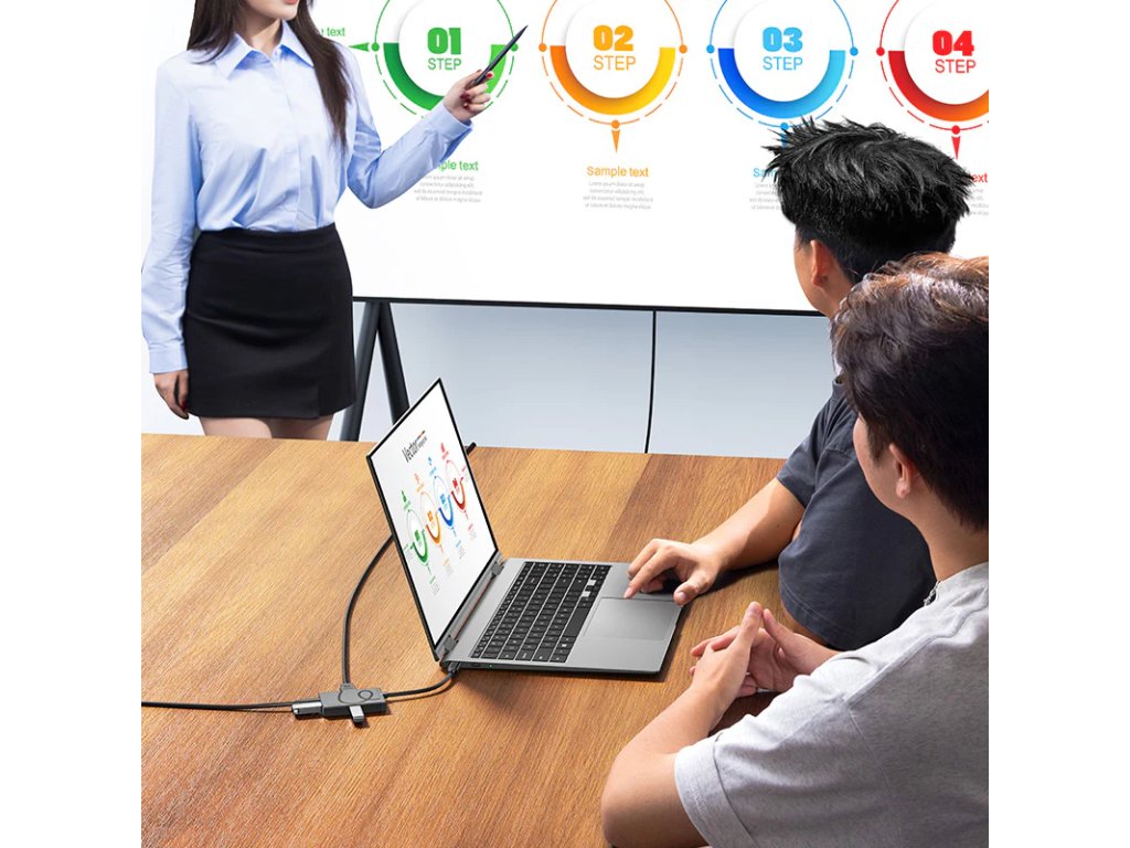 - 4K HDMI výstup: Umožňuje připojení k externímu displeji s rozlišením až 4K, ideální pro prezentace, streamování videa nebo rozšíření pracovní plochy.