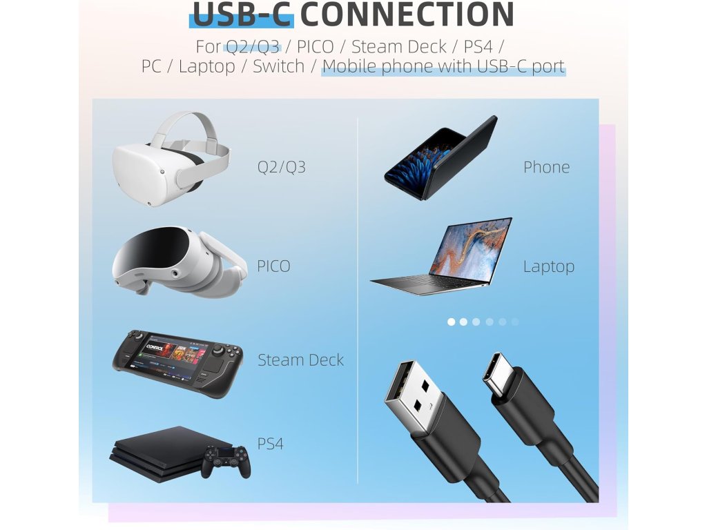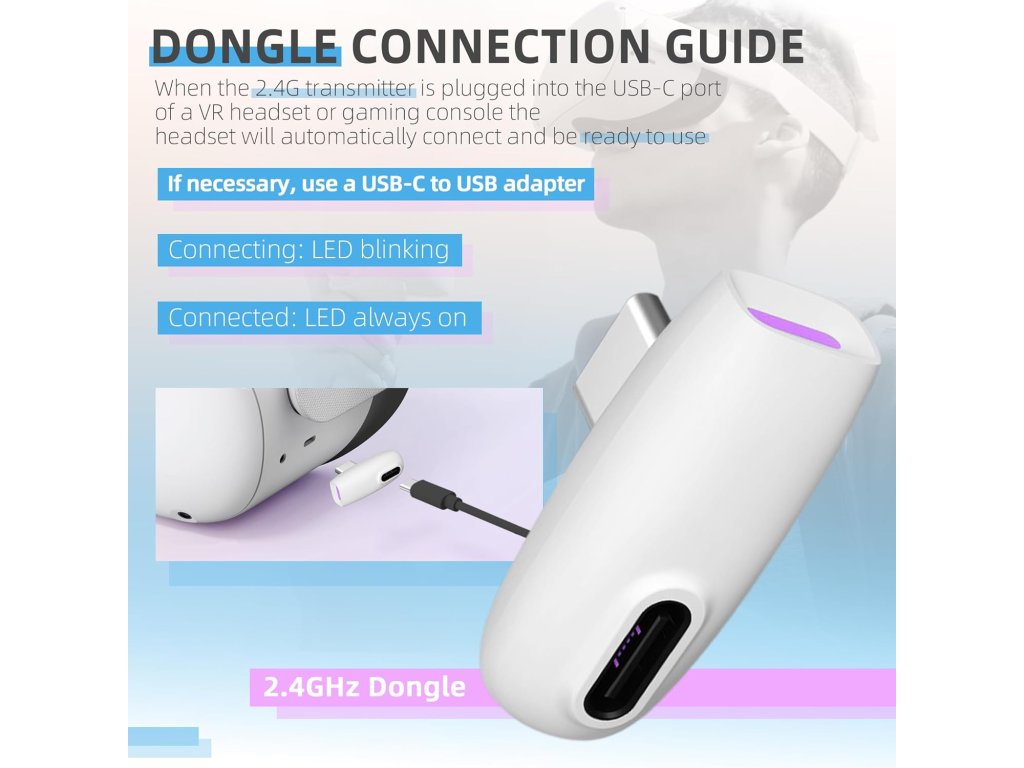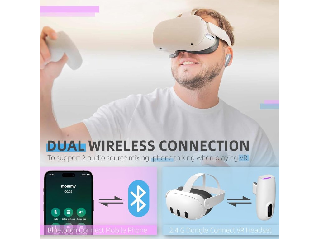Konektivita ve dvou režimech a přepínání mezi platformami: Užijte si současný požitek z náhlavních souprav VR, jako jsou Quest 3, 3S, 2, 1, Pico, a telefonních hovorů s duální konektivitou. Připojte VR headset přes plug-and-play 2,4G dongle a svůj telefon přes BT 5.2. Sluchátka jsou kompatibilní se zařízeními s portem USB-C, umožňujícím snadné přepínání mezi platformami VR, jako je PS5, Steam Deck a Switch to iOS, Android zařízení.