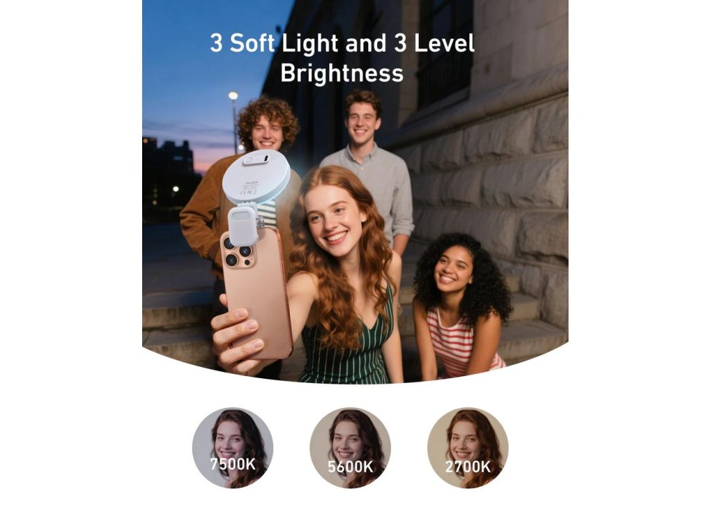 Kompaktní LED světlo navržené pro dokonalé osvětlení při focení, natáčení videí, videohovorech i každodenních selfie. Kombinuje tři režimy jasu, tři barevné teploty a integrované kosmetické zrcátko, takže vám pomůže vypadat skvěle v jakékoli situaci – doma, v kanceláři i na cestách.