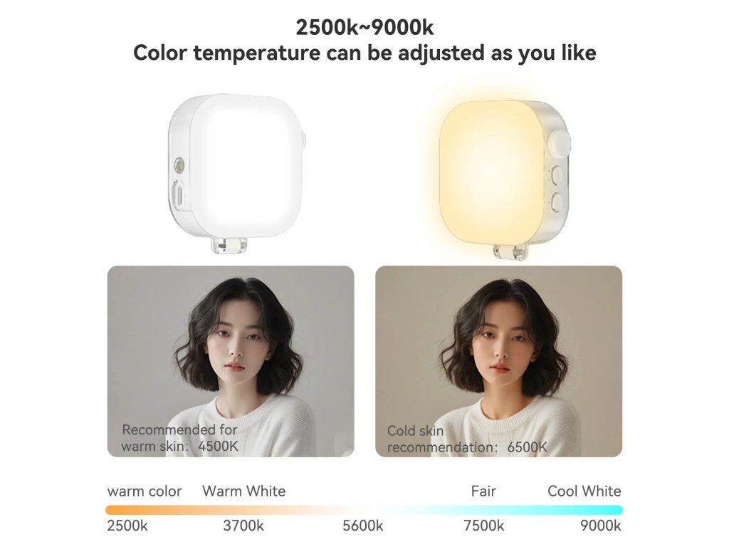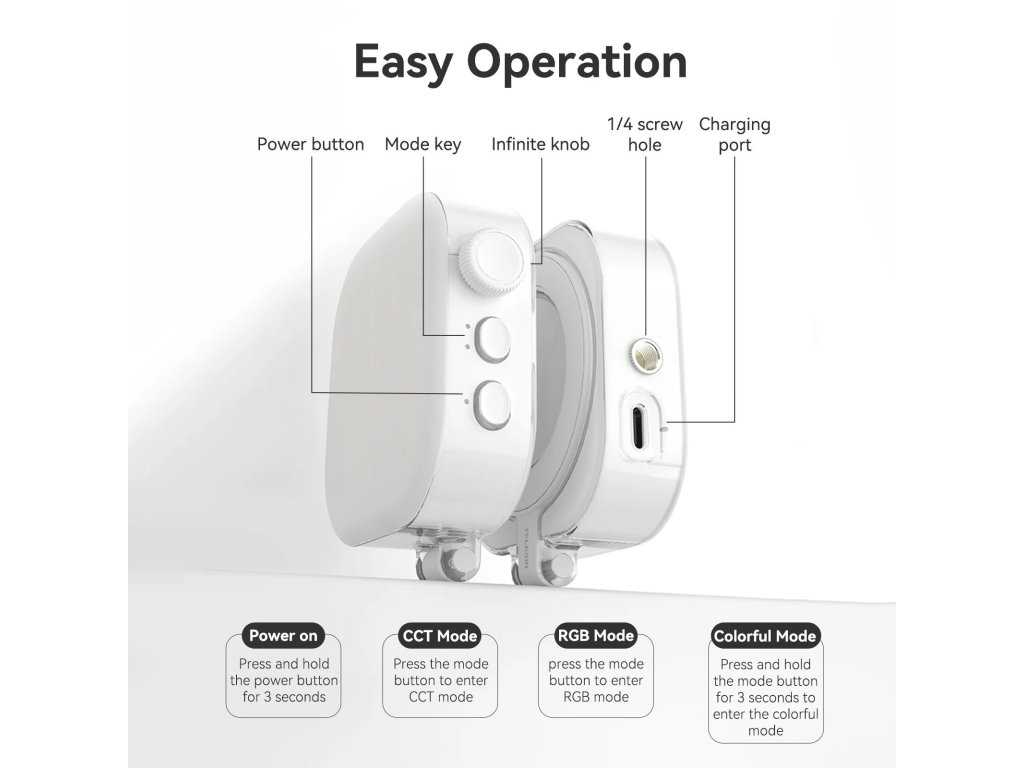 - Precizní ovládání: Boční kolečko a tlačítka umožňují jemné ladění intenzity a teploty světla bez skokových změn.