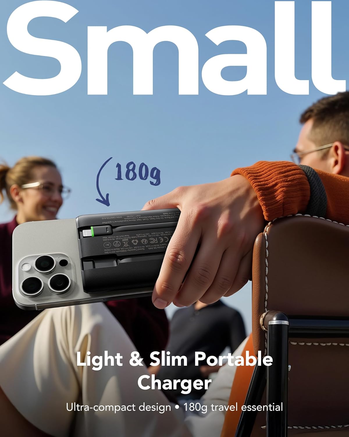 S pouhými 180 g je výrazně lehčí než srovnatelné modely, při plné kapacitě 10 000 mAh. Umožňuje až 1,7 nabíjení iPhone 17/16 a více než 1,5 nabíjení pro Galaxy S25/24, perfektní rovnováha mezi kompaktním designem a spolehlivým výkonem.