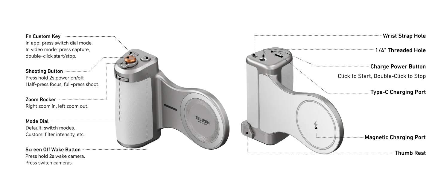 TELESIN Magnetic Pro Shot Imaging Camera Grip je magnetické MagSafe madlo pro iPhone (iPhone 12 a novější), které z telefonu udělá „skoro foťák“ – hlavně tím, jak se drží a jak se ovládá. Nasadíte ho magneticky na záda telefonu a místo ťukání do displeje máte v ruce fyzickou spoušť, přesný ovládací volič a tlačítka, která si nastavíte podle sebe. Je určené pro iOS 26.