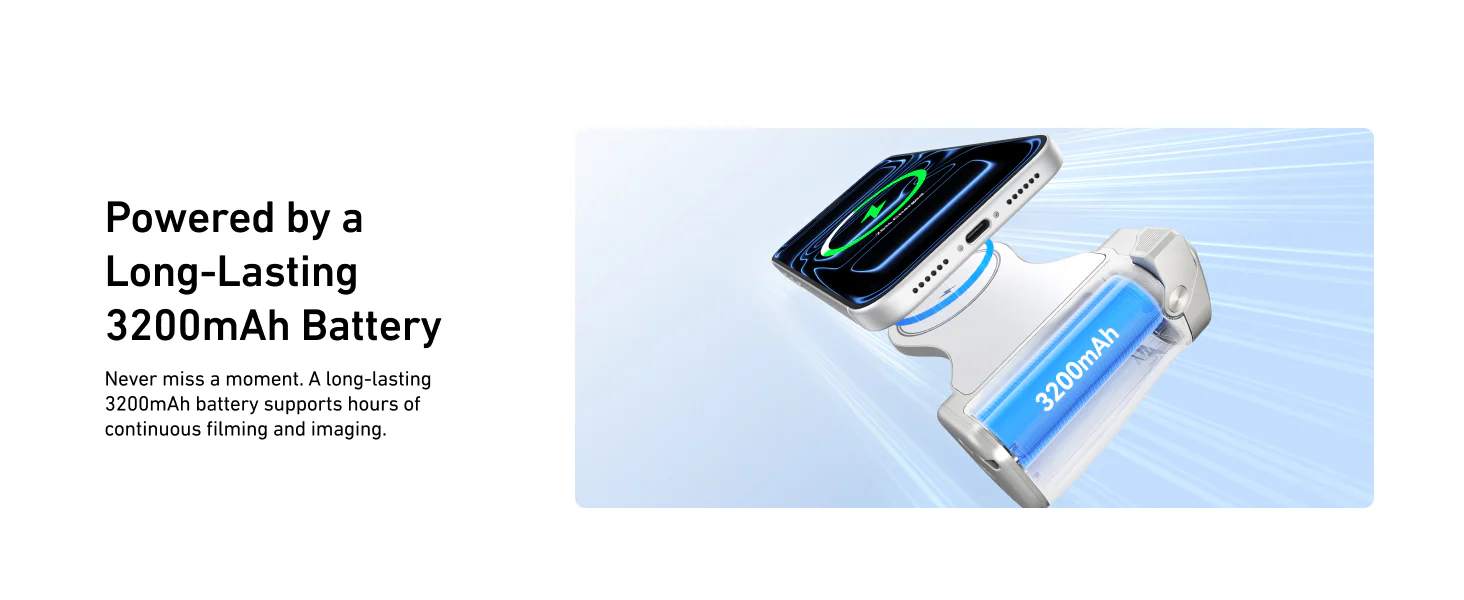 - integrovaná baterie 3200 mAh pro delší natáčení a bezdrátové dobíjení telefonu při používání