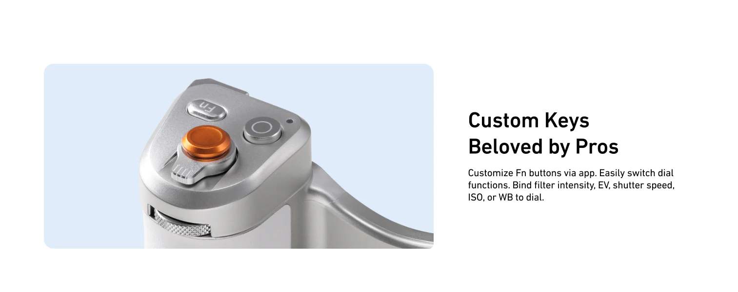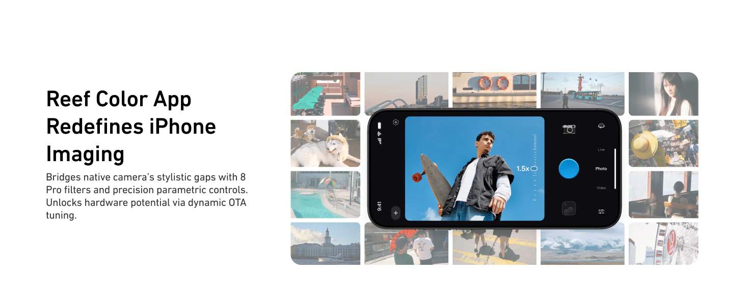 Uvnitř je baterie 3200 mAh a madlo umí bezdrátově dobíjet iPhone během natáčení, takže lépe ustojí delší 4K záběry, vyšší jas i náročnější práci s filtry. V kombinaci s aplikací Reef Color App můžete voličem řídit například zoom, intenzitu filtrů, EV, čas, ISO nebo vyvážení bílé a využít AI Master Filters pro hotový look bez zdlouhavého postprodukčního kolečka.