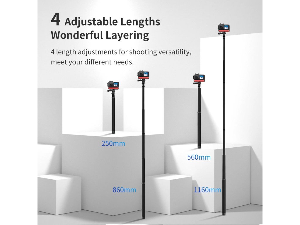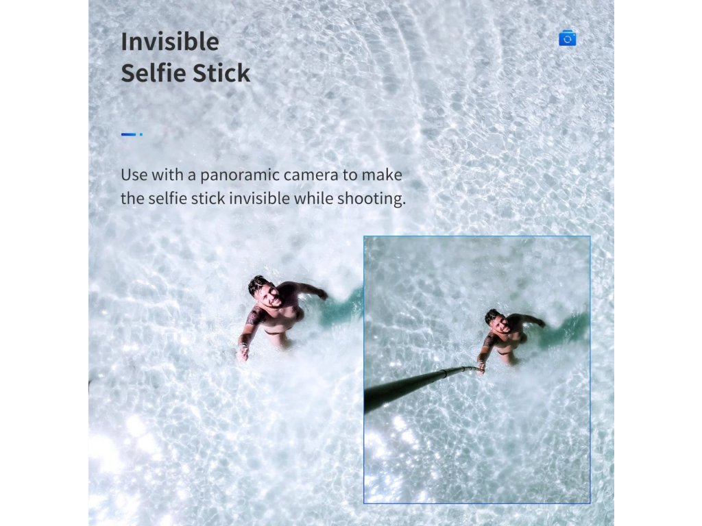 - Neviditelný efekt: speciální konstrukce zajišťuje, že tyč zůstává neviditelná při natáčení 360° videí – ideální pro plynulé a čisté záběry.