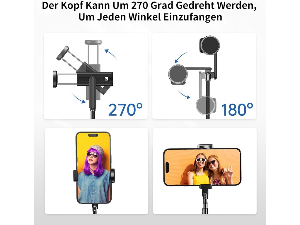 - Otočný držák telefonu: 270° otočný kloub a 180° nastavitelná tyč umožňují snadné přepínání mezi horizontální a vertikální polohou pro ideální úhel záběru.