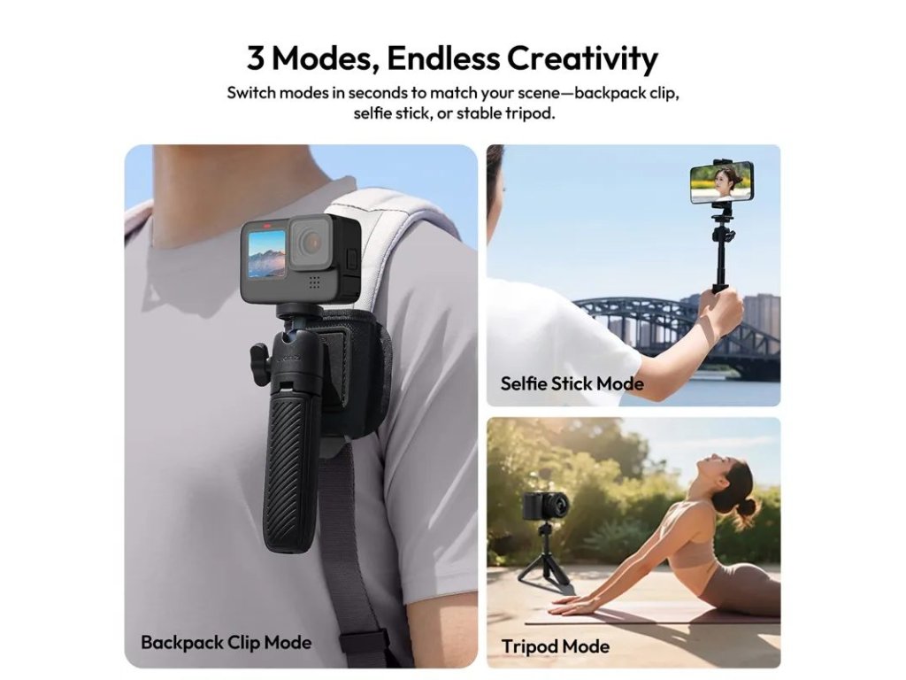 Kompaktní mini stativ a selfie držák, který díky chytrému systému ClipMate snadno upevníte na popruh batohu. Využijete ho s akční kamerou, fotoaparátem i telefonem, a to jak při cestování, tak při natáčení vlogů nebo každodenním focení.