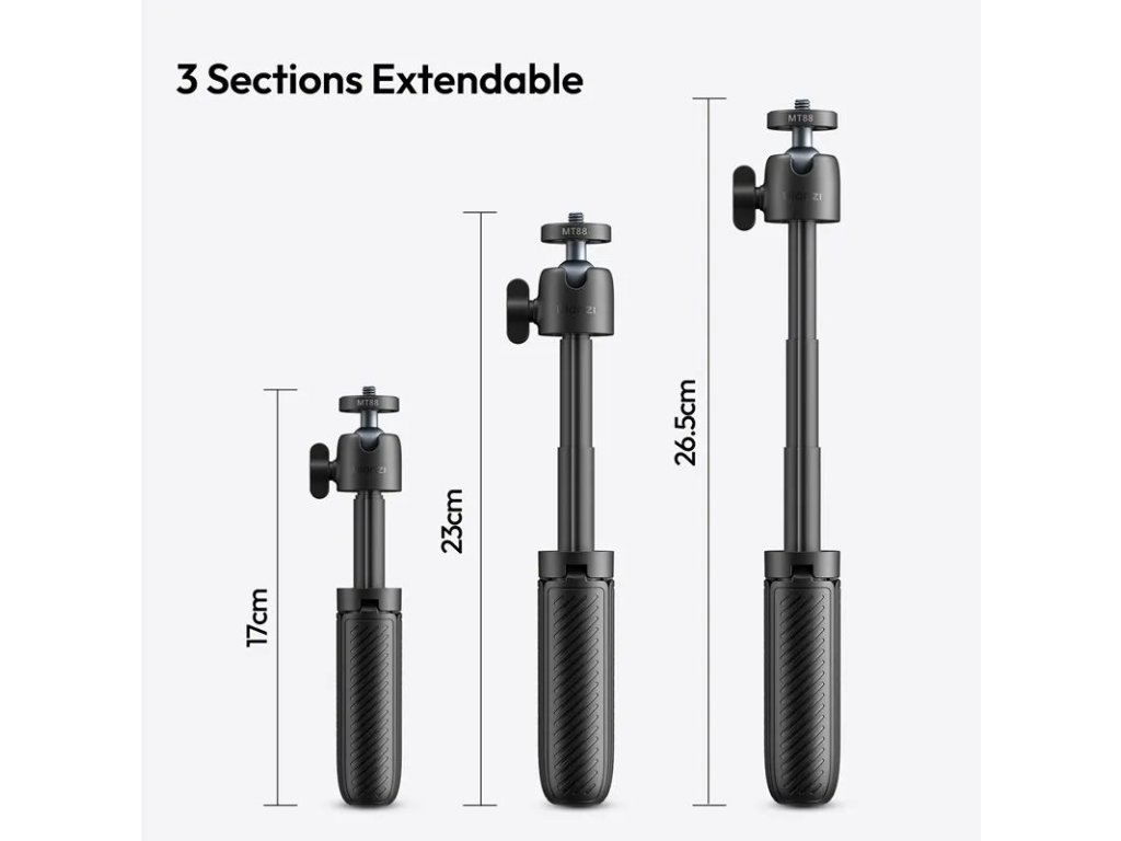 - Stativ i selfie tyč: konstrukce 2v1 umožňuje využít jej jako klasický stolní stativ nebo jako prodlužovací rukojeť pro natáčení z ruky.