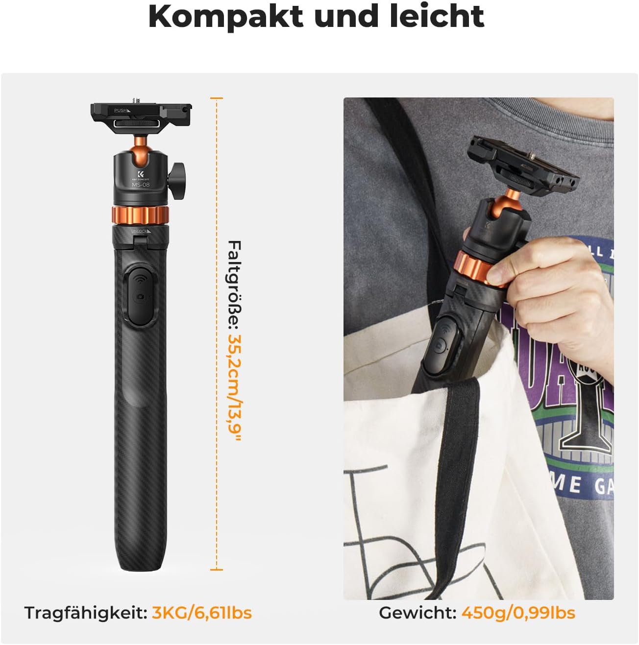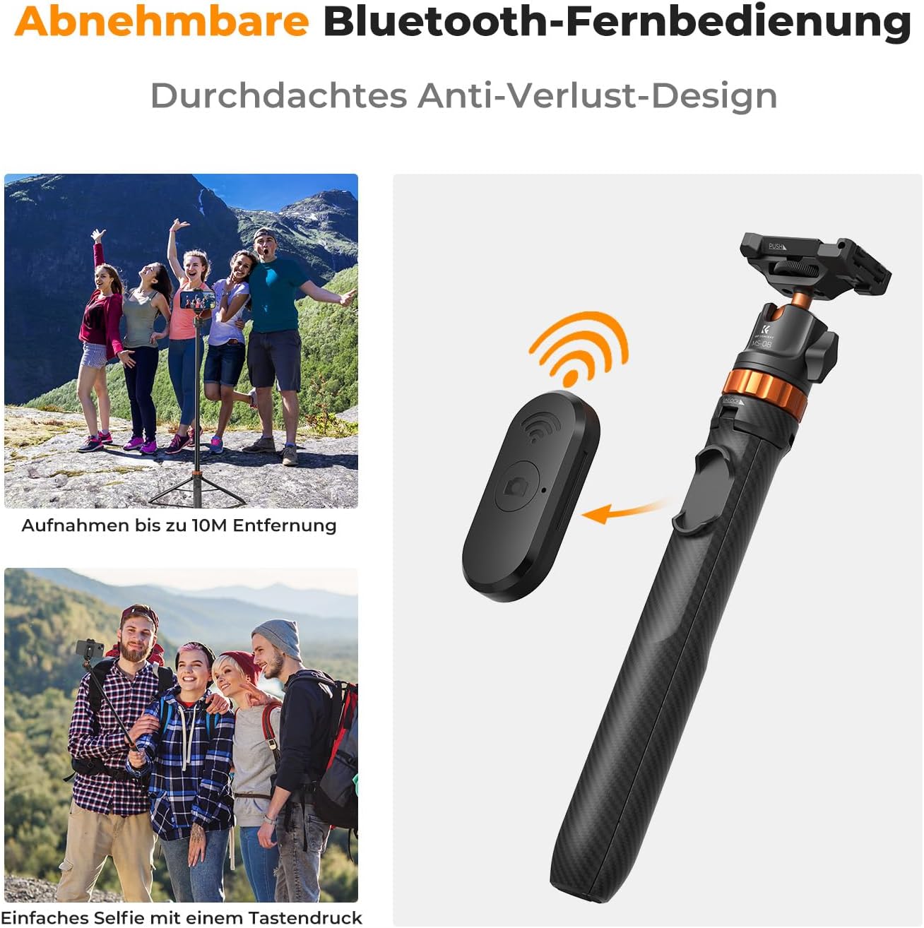 Teleskopická konstrukce umožňuje plynulé prodlužování, zatímco odnímatelný Bluetooth ovladač zajišťuje pohodlné spouštění na dálku. Kulová hlava poskytuje široké možnosti natočení, takže snadno nastavíte ideální úhel pro každý záběr.