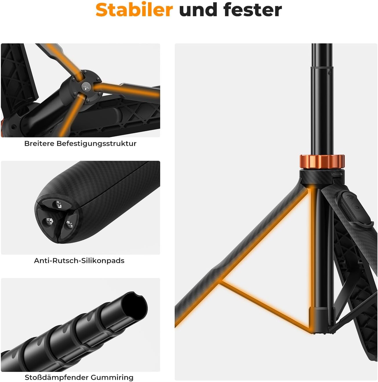 - Teleskopická selfie tyč: Vícedílný výsuvný mechanismus pro snadné prodloužení i kompaktní složení.