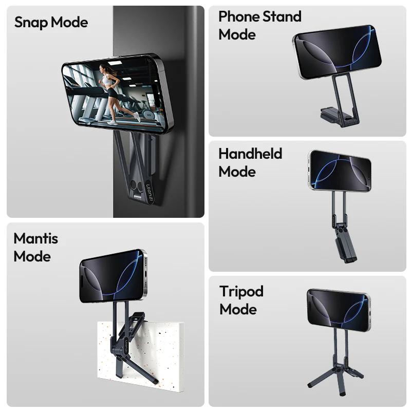 Ulanzi MA38 MagLock Phone Stand je extrémně tenký, skládací a přitom pevný MagSafe stojánek, který promění váš iPhone v držák na stůl, mini stativ, nástěnný držák nebo příslušenství pro natáčení videí. Díky chytrému třírežimovému designu ho můžete přichytit na kovové povrchy, zavěsit, postavit nebo použít jako klasický tripod. To vše ve formátu, který se po složení vejde do kapsy.