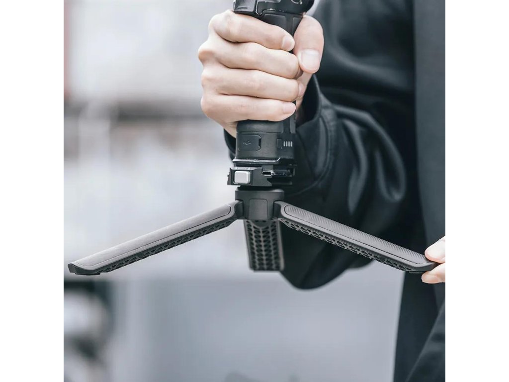 - Pohodlný úchop: Texturovaný povrch nohou a ergonomický profil z něj dělají bezpečný grip při použití jako ruční „handle“ pod gimbal nebo kameru.