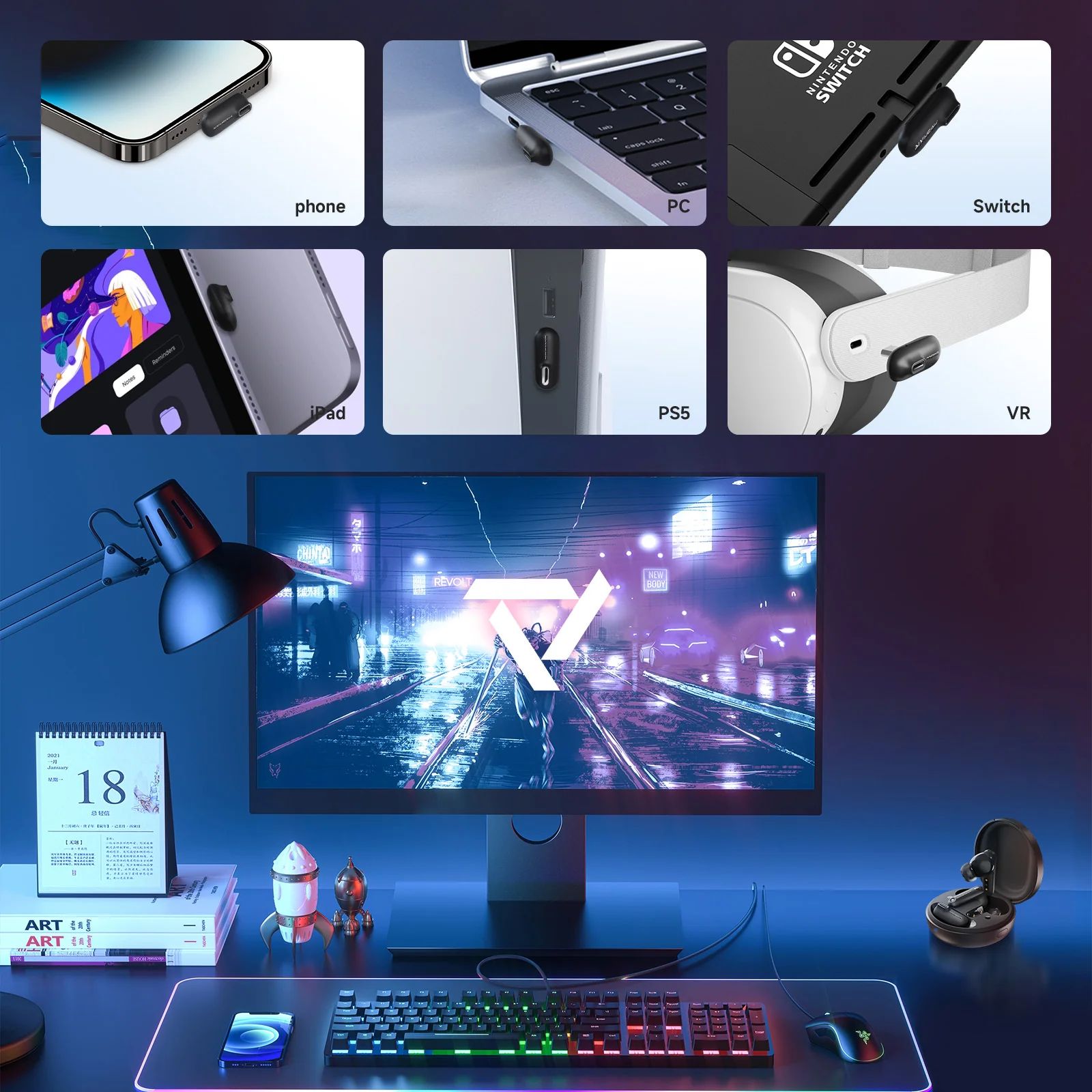 Součástí balení je také USB-C dongle, který zajišťuje bezproblémové propojení s VR headsety, konzolemi, telefony či počítači – a navíc umožňuje rychlé průchozí nabíjení 27 W, takže nepřijdete o jedinou minutu hraní. A díky ergonomickému tvaru se sluchátka pohodlně usadí v uchu i při dlouhém používání.
