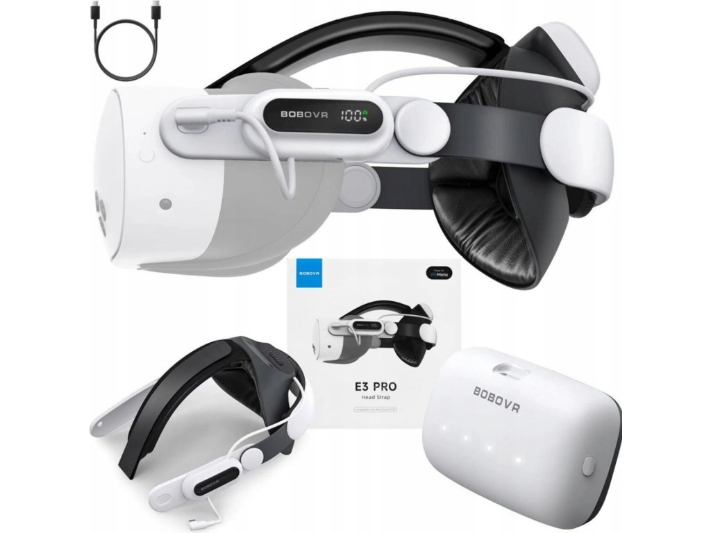 BOBOVR E3 Pro představuje prémiový komfortní strap s výměnnou baterií, navržený speciálně pro Meta Quest 3 a Quest 3S. Díky oficiální certifikaci Made for Meta splňuje nejvyšší standardy kvality i bezpečnosti a nabízí stabilní, pohodlné a dlouhodobé používání při hraní, práci i tréninku ve VR.